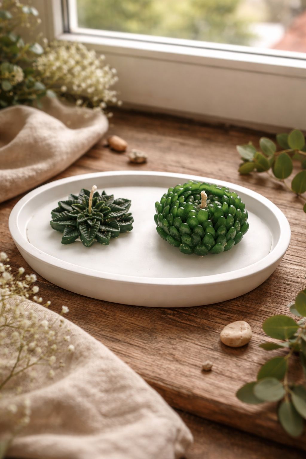 Botanik Sukulent Şeklinde Dekoratif Mum – Minimal & Doğal Tasarım Temalı 2’li Mum Tasarımı