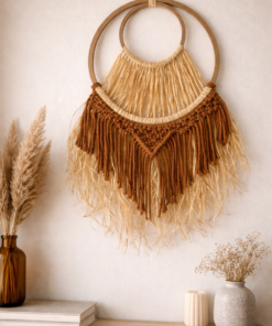 Doğalmız muz lifi ile yapılmıştır ortadaki detay kağıt ip ile örülmüştür. Halkanın çapı 30 santim ürünün toplam uzunluğu 55 santimdir